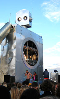 In de buik van de speciaal voor deze gelegenheid ontworpen Robot van 12 meter hoog, traden deze dag 12 dj's en acts op,